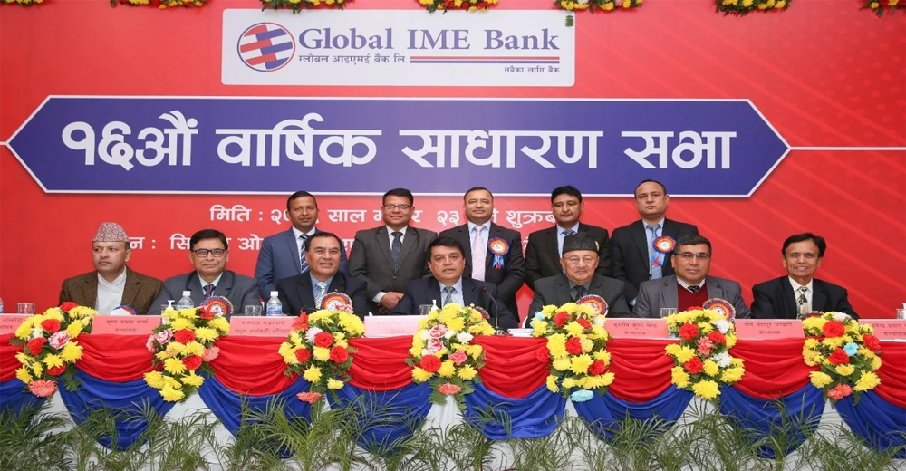 साधारणसभामा वार्षिक प्रतिवेदन प्रस्तुत गर्दै बैंकका अध्यक्ष ढकालले ग्लोबल आइएमई बैंक नेपाल सरकार एवं नेपाल राष्ट्र बैंकद्वारा घोषित नीतिहरुको परिपालना गर्दै आफ्ना शेयरधनीहरुलाई उचित लाभांश प्रदान गर्न कटिबद्ध रहेको बताउनुभयो ।