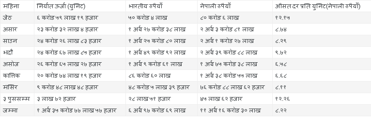 प्राधिकरणले गत आर्थिक वर्ष २०७८/७९ को जेठ तथा असारमा २९ करोड ९१ लाख युनिट विद्युत् निर्यात गरी रु दुई अर्ब ८३ करोड ८८ लाख आम्दानी गरेको थियो । चालु आवको पुस ३ सम्ममा एक अर्ब पाँच करोड ८६ लाख ३४ हजार युनिट विद्युत् निर्यात गरी रु आठ अर्ब ३२ करोड ४२ लाख ४० हजार आर्जन गरेको छ ।