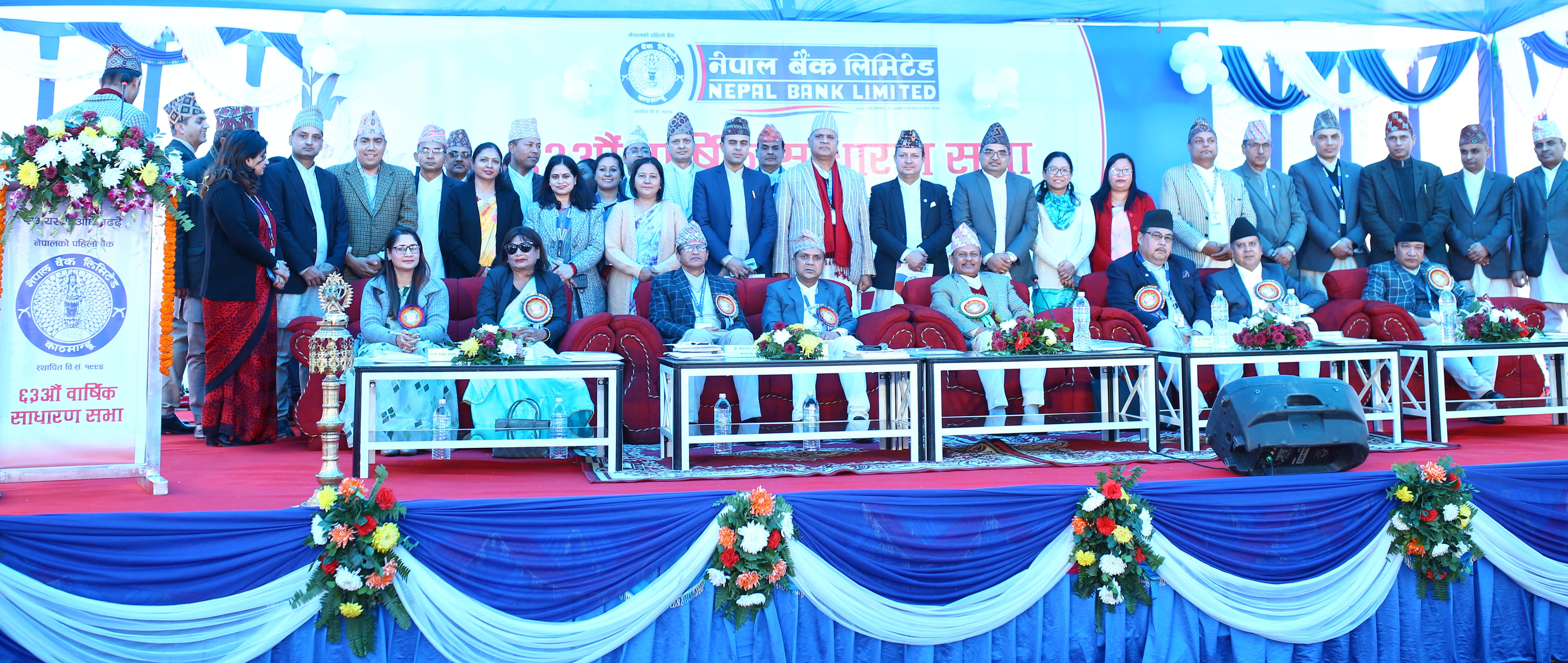 काठमाडाैँ । नेपाल बैंकको ६३ औँ वार्षिक साधारण सभा शुक्रबार सम्पन्न भएकाे छ। प्रधान कार्यालय, धर्मपथ, काठमाडौँमा आज पुस २९ गते भएकाे वार्षिक साधारण सभामार्फत १२ प्रतिशत लाभांश पारित गरिएकाे बैंकले जनाएकाे छ।