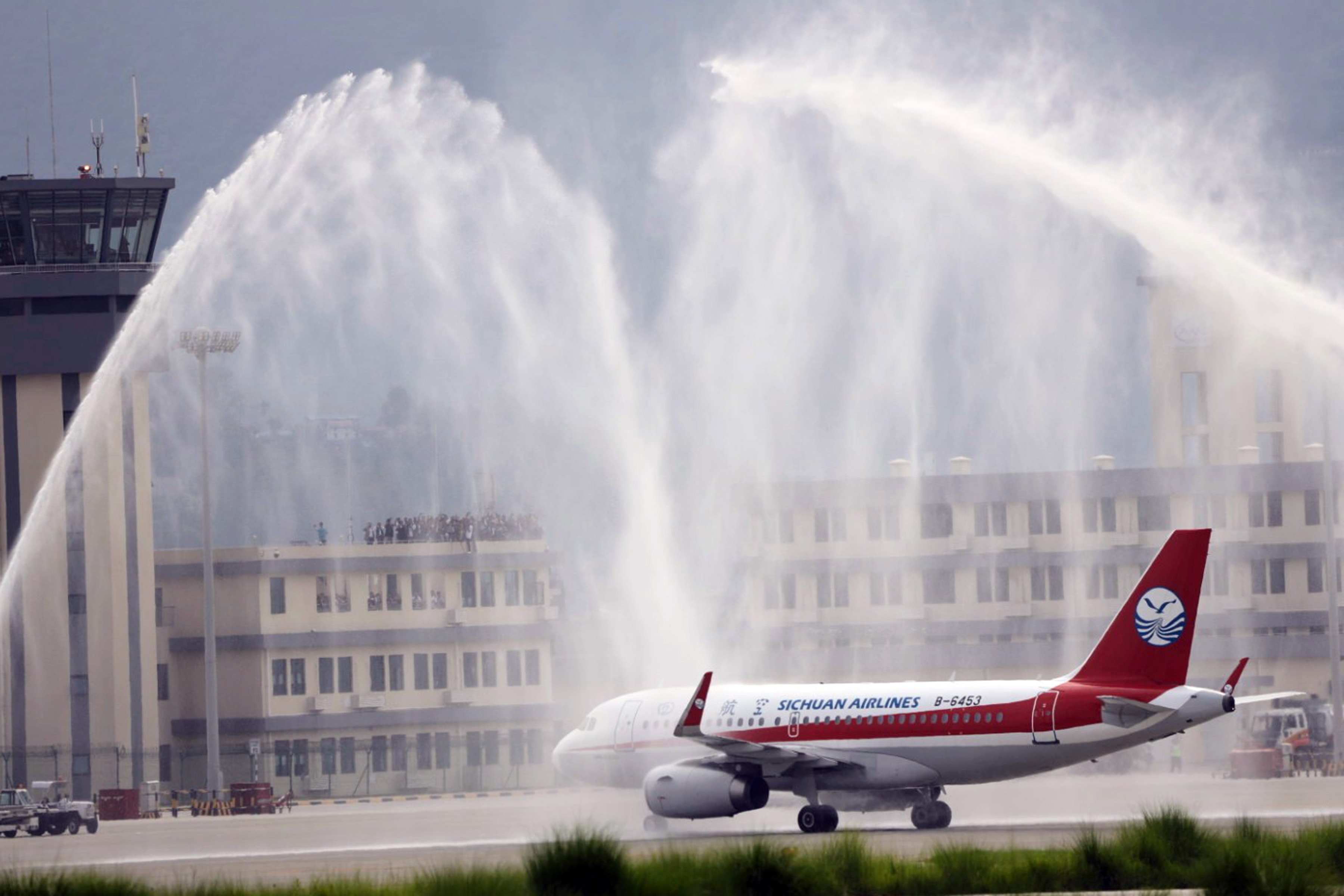 चीनको छेन्दुबाट आएको सिचुआन एयरलाइन्स आज विहान ९ः०६ बजे अवतरण हुँदा ‘वाटर क्यानन सल्युट’ले स्वागत गरियो । पहिलो अन्तर्राष्ट्रिय उडानका रुपमा ८४ जना यात्रु बोकेर आएको १३१ सिट क्षमताको चिनियाँ सिचुआन एयरलाइन्सलाई स्वागत गर्न पोखरेलीहरु बाजागाजासहित विमानस्थल पुगेका थिए । विमानका यात्रुहरुलाई पर्यटन व्यवसायीले माला र खादाले स्वागत गरे । उनीहरुलाई नेपाली ढाका टोपी लगाएर आतिथ्यता दर्शाए ।