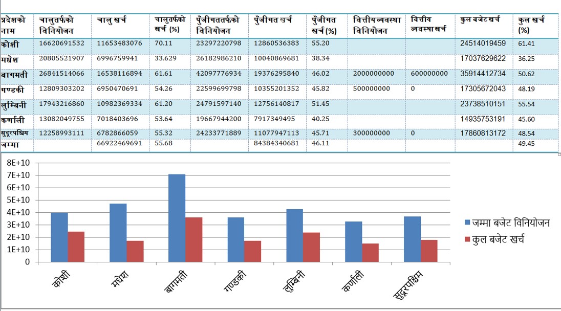 सो अवधिमा बागमती प्रदेशले ५० दशमलव ६२ प्रतिशत, गण्डकी प्रदेशले ४८ दशमलव १९ प्रतिशत, लुम्बिनी प्रदेशले ५५ दशमलव ५४ प्रतिशत, कर्णाली प्रदेशले ४५ दशमलव ६० प्रतिशत र सुदूरपश्चिम प्रदेशले ४८ दशमलव ५४ प्रतिशत बजेट खर्च गरेको देखिन्छ । सो अवधिमा चालुतर्फको औसत खर्च ५५ दशमलव ६८ प्रतिशत र पुँजीगततर्फको औसत खर्च ४६ दशमलव ११ प्रतिशत छ ।