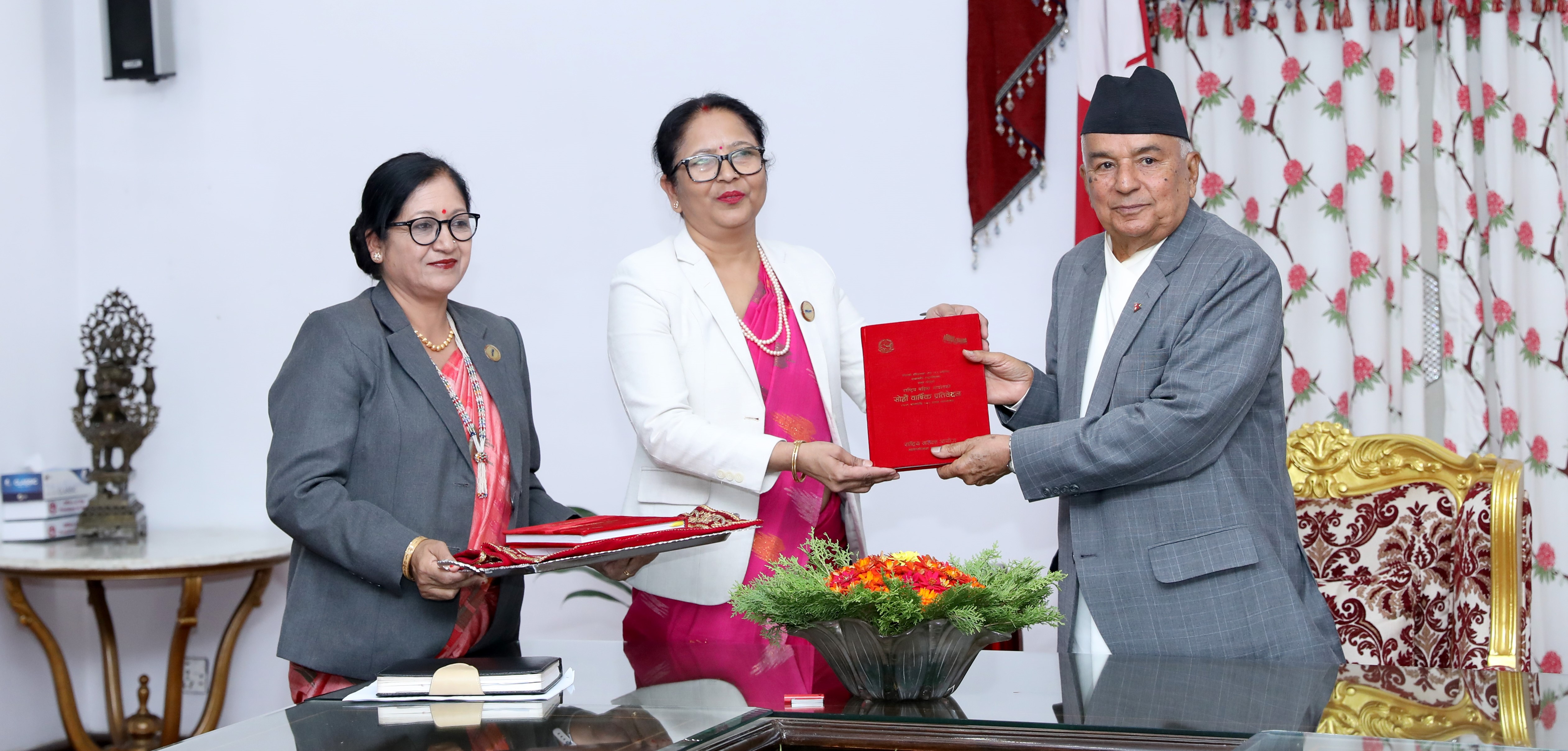 राष्ट्रपति कार्यालयमा आज आयोजित बेग्लाबेग्लै कार्यक्रममा राष्ट्रिय महिला आयोगका अध्यक्ष कमला पराजुलीले आयोगको १६औँ वार्षिक प्रतिवेदन र मधेसी आयोगका अध्यक्ष डा विजयकुमार दत्तले आफू नेतृत्वको आयोगको प्रतिवेदन प्रस्तुत गर्नुभएको हो ।