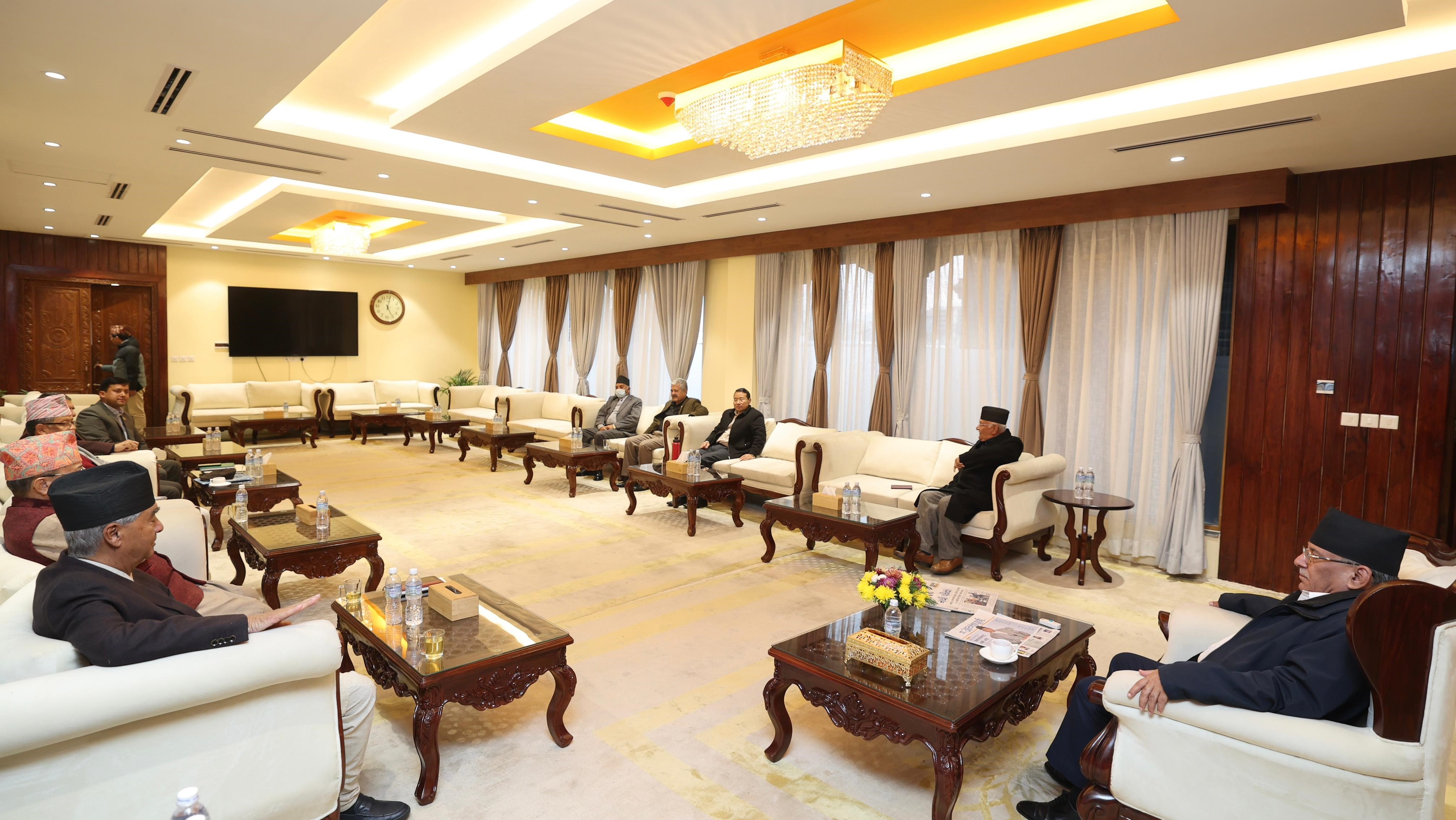 बैठकमा प्रधानमन्त्री एवं नेकपा (माओवादी केन्द्र)का अध्यक्ष पुष्पकमल दाहाल ‘प्रचण्ड’, सत्ता साझेदार नेपाली कांग्रेसका सभापति शेरबहादुर देउवा, प्रमुख प्रतिपक्षी दलका नेता एवं नेकपा (एमाले)का अध्यक्ष केपी शर्मा ओली सहभागी हुनुहुन्थ्यो ।