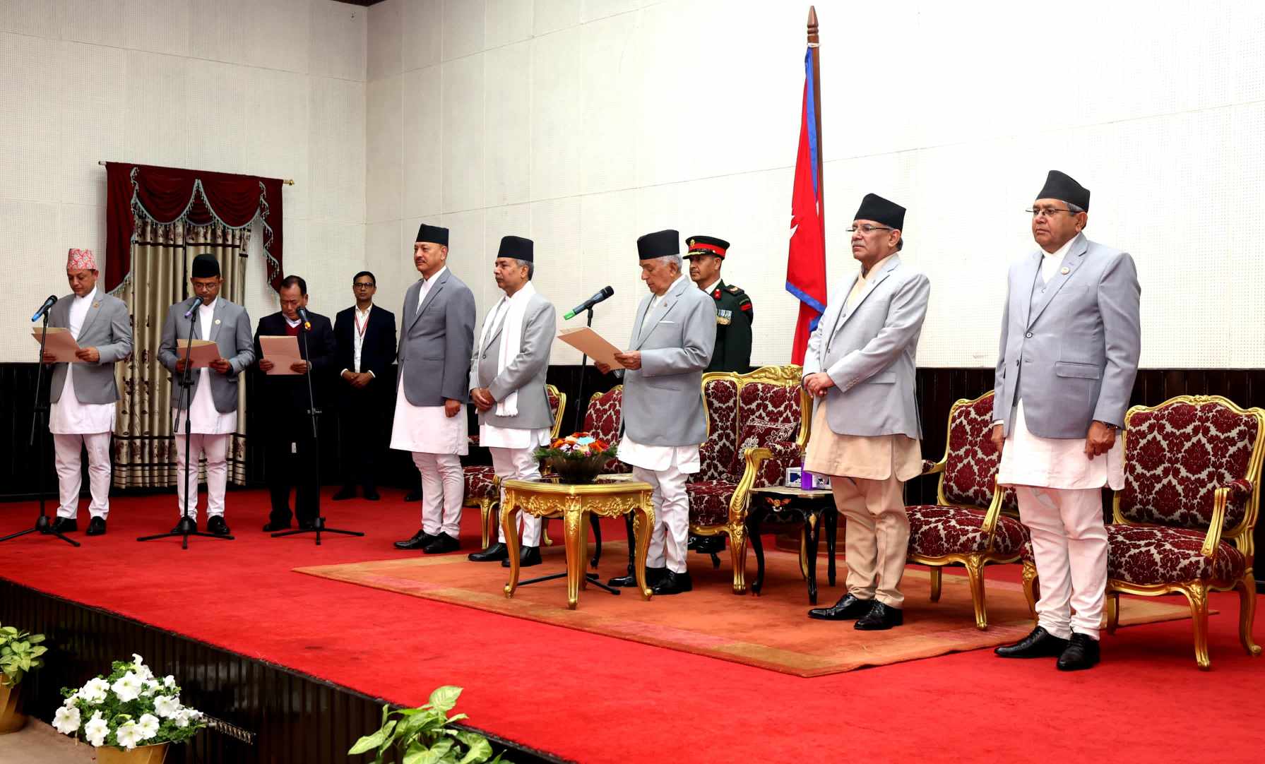 राष्ट्रपतिले नेपालको संविधानका धारा, ७६ को उपधारा ९ बमोजिम प्रधानमन्त्री पुष्पकमल दाहाल ‘प्रचण्ड’को सिफारिसमा मन्त्रीमा नियुक्त भएका तीनजनालाई राष्ट्रपति कार्यालय शीलत निवासमा आज आयोजित विशेष समारोहमा सोही संविधानको धारा, ८० अनुसार पद तथा गोपनीयताको शपथ गराएका हुन् ।