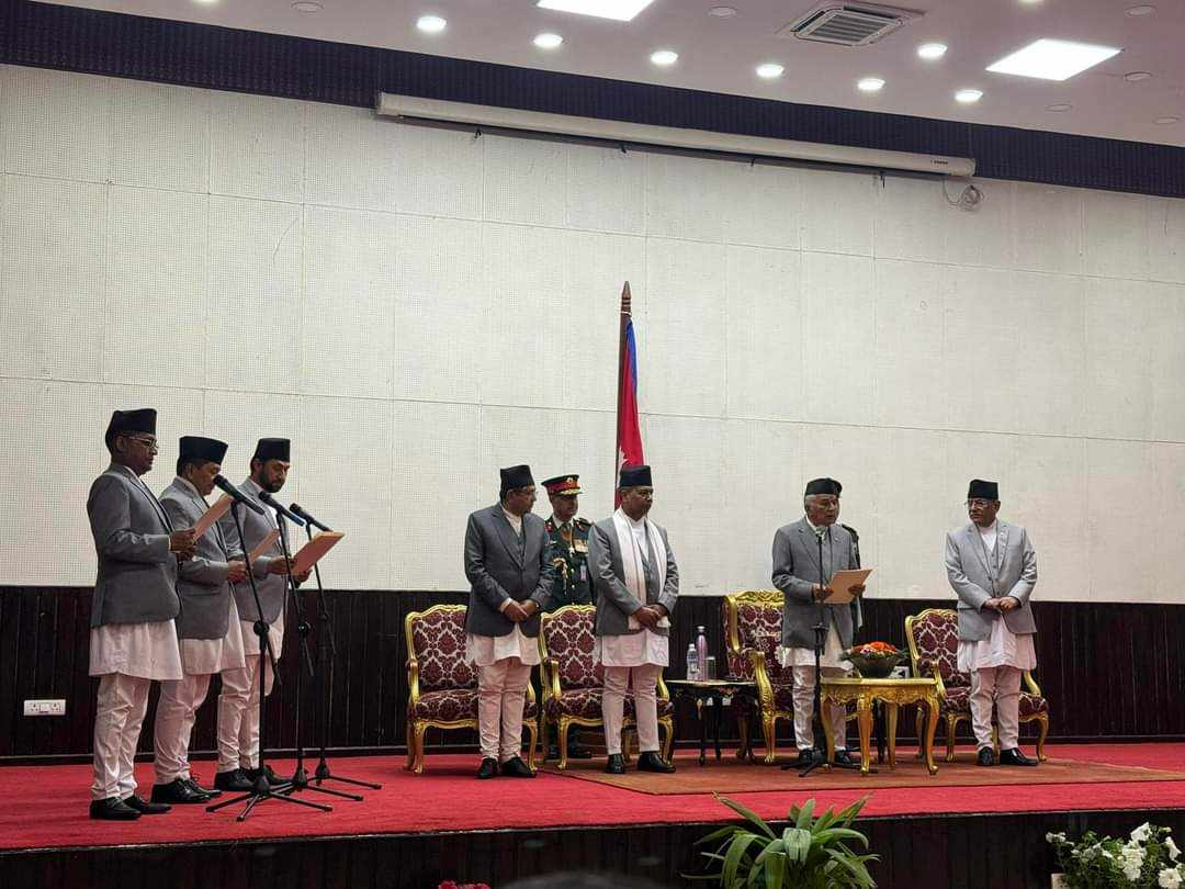 राष्ट्रपति पौडेलले नेपालको संविधानको धारा ८० अनुसार प्रधानमन्त्री पुष्पकमल दाहाल ‘प्रचण्ड’को सिफारिसमा उपप्रधानमन्त्रीसहित नवनियुक्त मन्त्रीहरुलाई आज राष्ट्रपति कार्यालय शीतल निवासमा आयोजित समारोहमा पद तथा गोपनीयताको शपथ गराउनुभएको हो ।