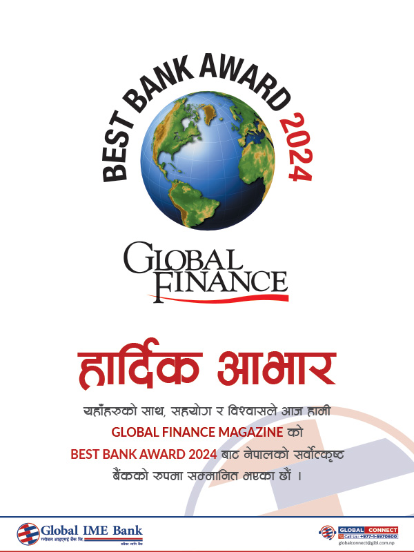 ग्राहकहरुको आवश्यकतालाई मध्यनजर गरी समयसान्दर्भिक नविनतम् सेवाहरु प्रदान गर्दै आइरहेको ग्लोेबल आइएमई बैंकलाई ग्लोबल फाइनान्सबाट “नेपालको उत्कृष्ट बैंक” को सम्मानले आगामी दिनमा बैंकलाई रचनात्मक सेवाहरु प्रदान गर्न थप उत्साहित गर्ने बैंकले विश्वास लिएको छ।