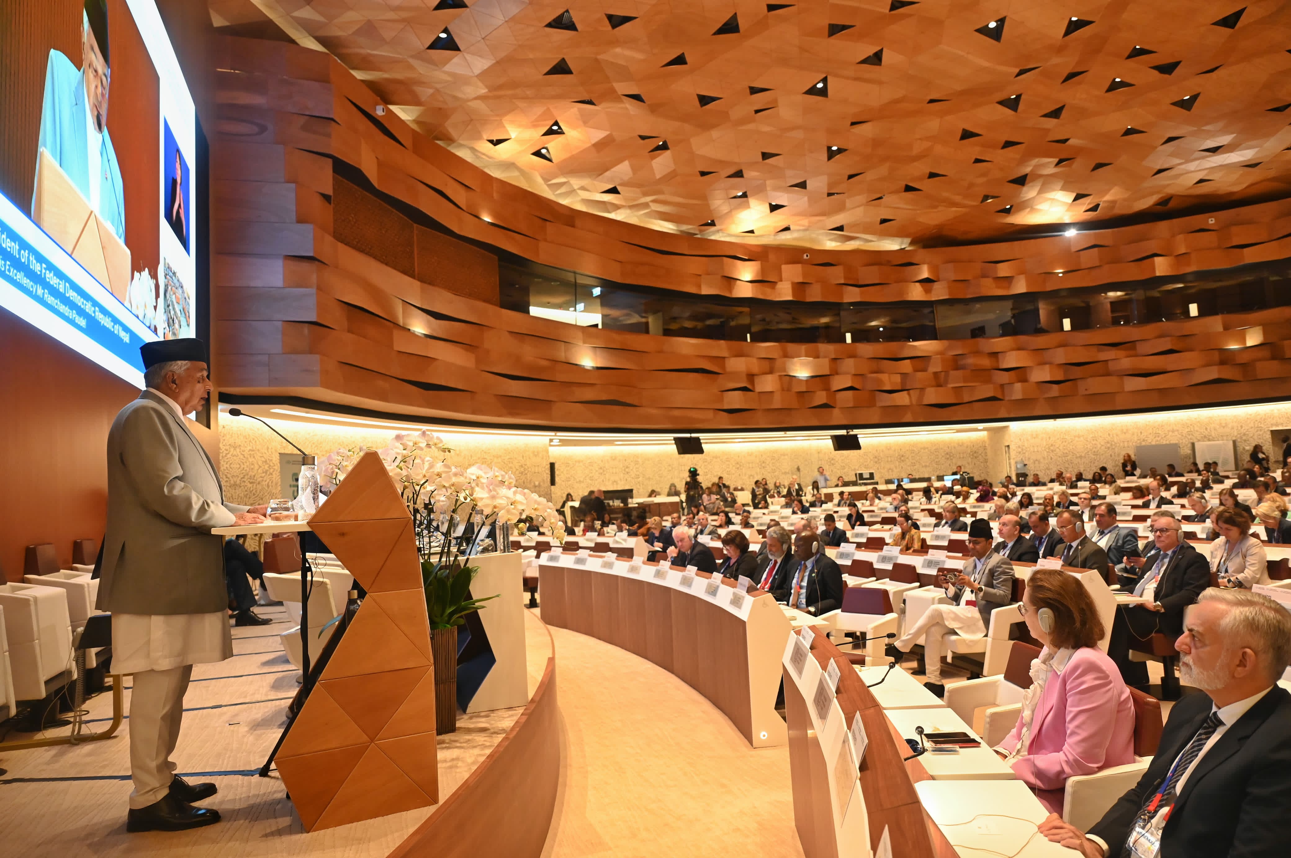 राष्ट्रपति पौडेलले विश्वले विद्युतीय, दूरसेवा अर्थतन्त्रलगायत नवीन चुनौतीलाई आत्मसात् गरेकाले यी सबै क्षेत्रमा मर्यादित श्रमको कार्यसूची कार्यान्वयन गर्न प्रतिबद्घ रहेको उल्लेख गर्नुभयो । “हामीले नयाँ काम, सीप र कार्यस्थलका लागि आफूलाई तयार राख्नुपर्दछ”, उहाँले भन्नुभयो, “विकासमा खर्च गर्नुपर्ने ठूलो रकम घातक हतियारमा लगानी गरिएको छ, अन्तर्राष्ट्रिय समुदायले यो पथलाई उल्ट्याउनुपर्छ र समग्र मानवताको समृद्धिका लागि स्रोतहरू परिचालन गर्नुपर्छ ।”