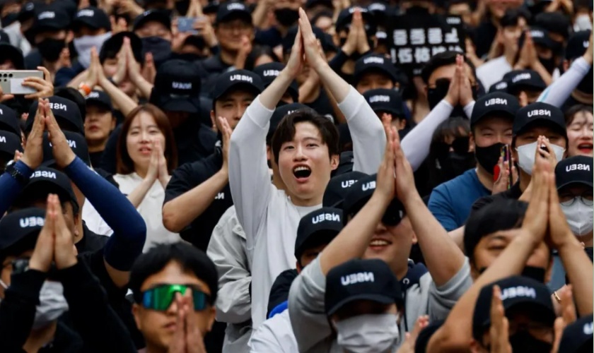सियोलबाट एक घण्टा दक्षिणमा रहेको ग्योङगीको ह्वासेओङमा रहेको कम्पनीको फाउण्ड्री र सेमीकन्डक्टर फ्याक्ट्रीबाहिर हजारौं मजदुरहरू बर्षादी र रिबन लगाएर भेला भएका दशौं हजार कर्मचारीहरूको प्रतिनिधित्व गर्ने एक युनियनका प्रमुखले एएफपीलाई बताउनुभयो ।