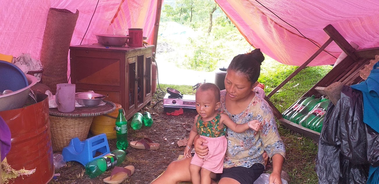 लेखनाथ । सत्ताइस वर्षीया निग्मा शेर्पा वर्षौंदेखि बस्दै आएको घर सेती बाढीले बगाइदिएपछि डेढ वर्षीया छोरी काखमा च्याप्दै, नदी किनारको चौरमा त्रिपालभित्र बिहानको खाना पकाउँदै हुनुहुन्थ्यो । उहाँको एकमात्र साहारा ३१ वर्षीय श्रीमान् प्रेम शेर्पा दुई वर्षदेखि बेखबर हुनुुहुन्छ ।
