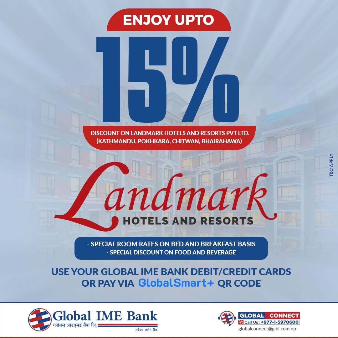 काठमाडौँ: ग्लोबल आइएमई बैंक लिमिटेडका ग्राहकहरुलाई ल्याण्डमार्क होटल एण्ड रिर्सोटमा १५ प्रतिशतसम्म छुट प्रदान गर्ने समझदारी भएको छ।