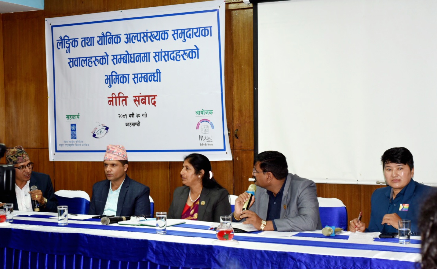 मितेरी नेपालले आज यहाँ आयोजना गरेको ‘लैङ्गिक तथा यौनिक अल्पसङ्ख्यक समुदायका सवालहरुको सम्बोधनमा सांसदहरुको भूमिका’ विषयक नीति संवाद कार्यक्रममा उक्त समुदायले आफूहरु नेपालको नागरिक भए पनि अन्य नागरिक जस्तै समान हक नपाएको बताएका हुन् ।