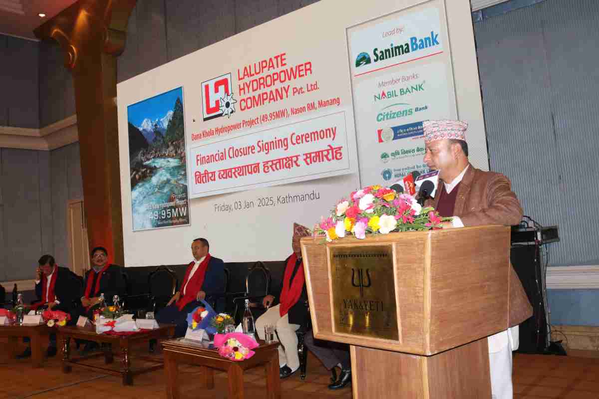 लालुपाते हाइड्रोपावरद्वारा मनाङको नासोङ गाउँपालिका–२ मा निर्माण हुन लागेको ४९.९५ मेगावाटको दानाखोला हाइड्रोपावरको वित्तिय व्यवस्थापन हस्ताक्षर समारोहमा शुक्रबार साँझ आयोजित कार्यक्रममा बोल्दै उहाँले निजी क्षेत्रलाई साथमा लिएर सरकारले राखेको ऊर्जा विकासको लक्ष्य पुरा गरिने बताउनुभएको हो ।