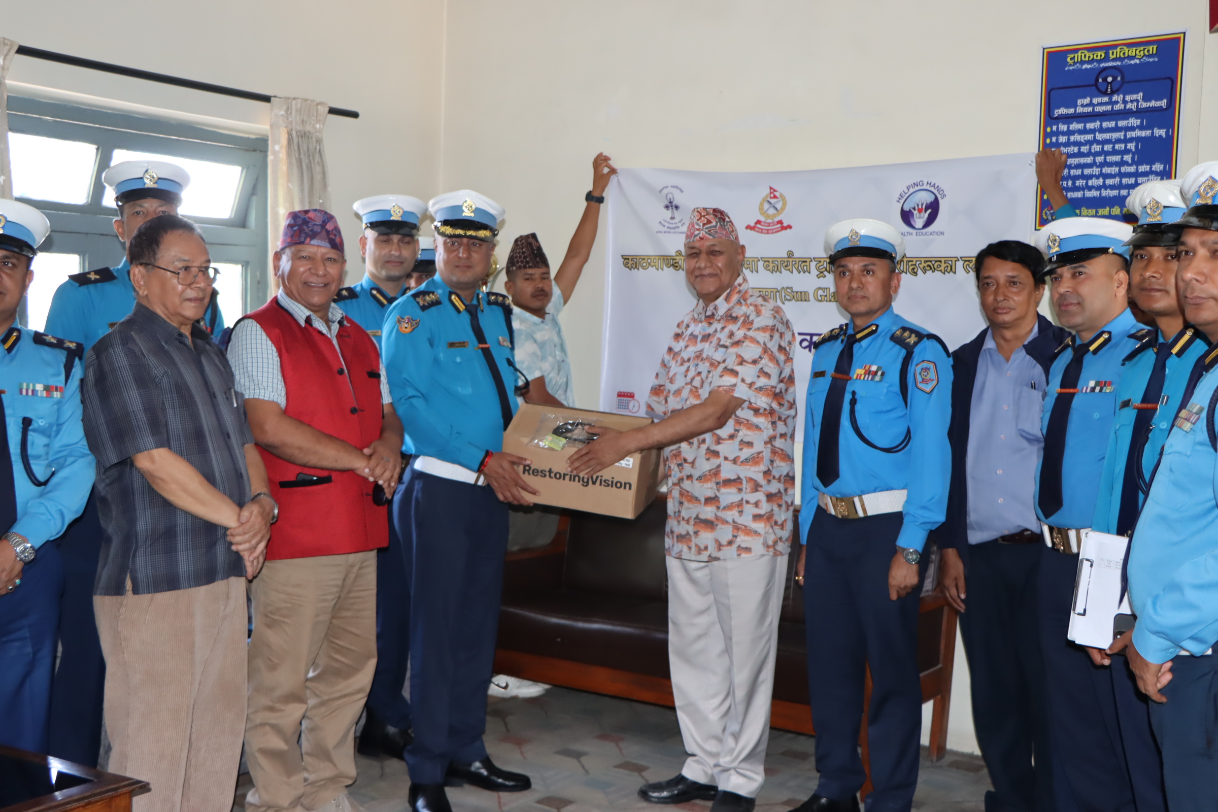 सङ्घका अध्यक्ष प्रा डा चेतराज पन्तले काठमाडौँ उपत्यका ट्राफिक प्रहरी कार्यालयका प्रमुख प्रहरी वरिष्ठ उपरीक्षक नवराज अधिकारीलाई चश्मा हस्तान्तरण गर्नुभयो। सो अवसरमा अध्यक्ष प्राडा पन्तले भन्नुभयो “ बढी समय धुवाँधुलो र प्रत्यक्ष प्रकाशको किरणमा खटी नागरिकलाई सेवाप्रवाह गरिरहनुभएका ट्राफिक प्रहरीमा आँखाको समस्या देखिने जोखिम बढी हुने भएकाले उहाँहरूको आँखाको सुरक्षाका लागि चश्मा वितरण गरिएको हो।”