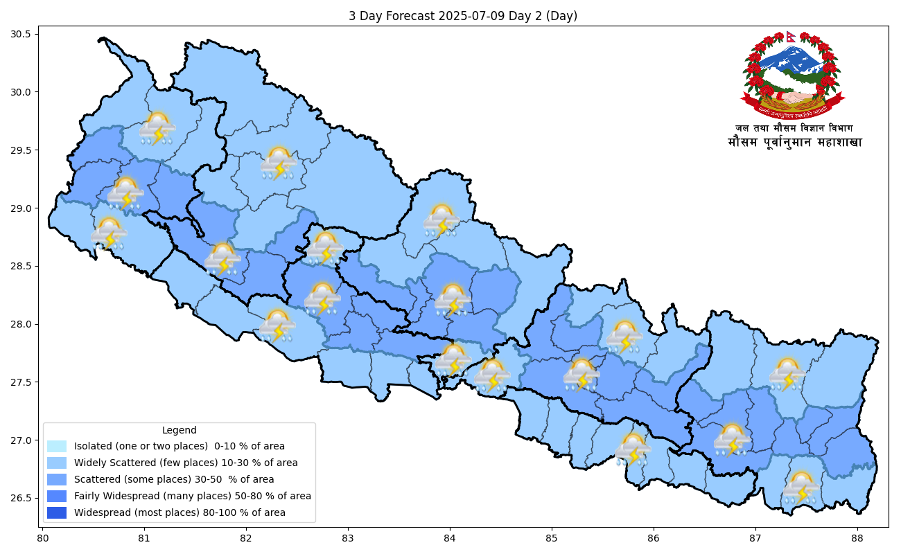 आज दिउँसो देशभर आंशिकदेखि साधारणतया बदली रहने छ। महाशाखाका अनुसार वाग्मती, गण्डकी र लुम्बिनीलगायत अन्य प्रदेशका पहाडी भागका केही स्थानमा मेघगर्जन र चट्याङसहित हल्कादेखि मध्यम वर्षाको सम्भावना छ। गण्डकी, कर्णाली र सुदूरपश्चिम प्रदेशको एकदुई स्थानमा भारी वर्षाको सम्भावना छ। साथै उच्चपहाडी तथा हिमाली भागका केही स्थानमा हल्कादेखि मध्यम वर्षा र हिमपातको सम्भावना छ।