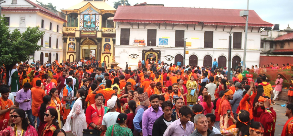 रातो र हरियो पहिरनमा सजिएका भक्तजनले पशुपति क्षेत्र भरिभराउ छ। साउनको सोमबारलाई लक्षित गरेर कोषले अतिरिक्त जुत्ताचप्पल कक्षको व्यवस्था गरेको छ। भक्तजनको भीड बढ्ने भएपछि सुरक्षालगायत सबै प्रबन्ध गरिएको सदस्य सचिव जोशीले जानकारी दिनुभयो।