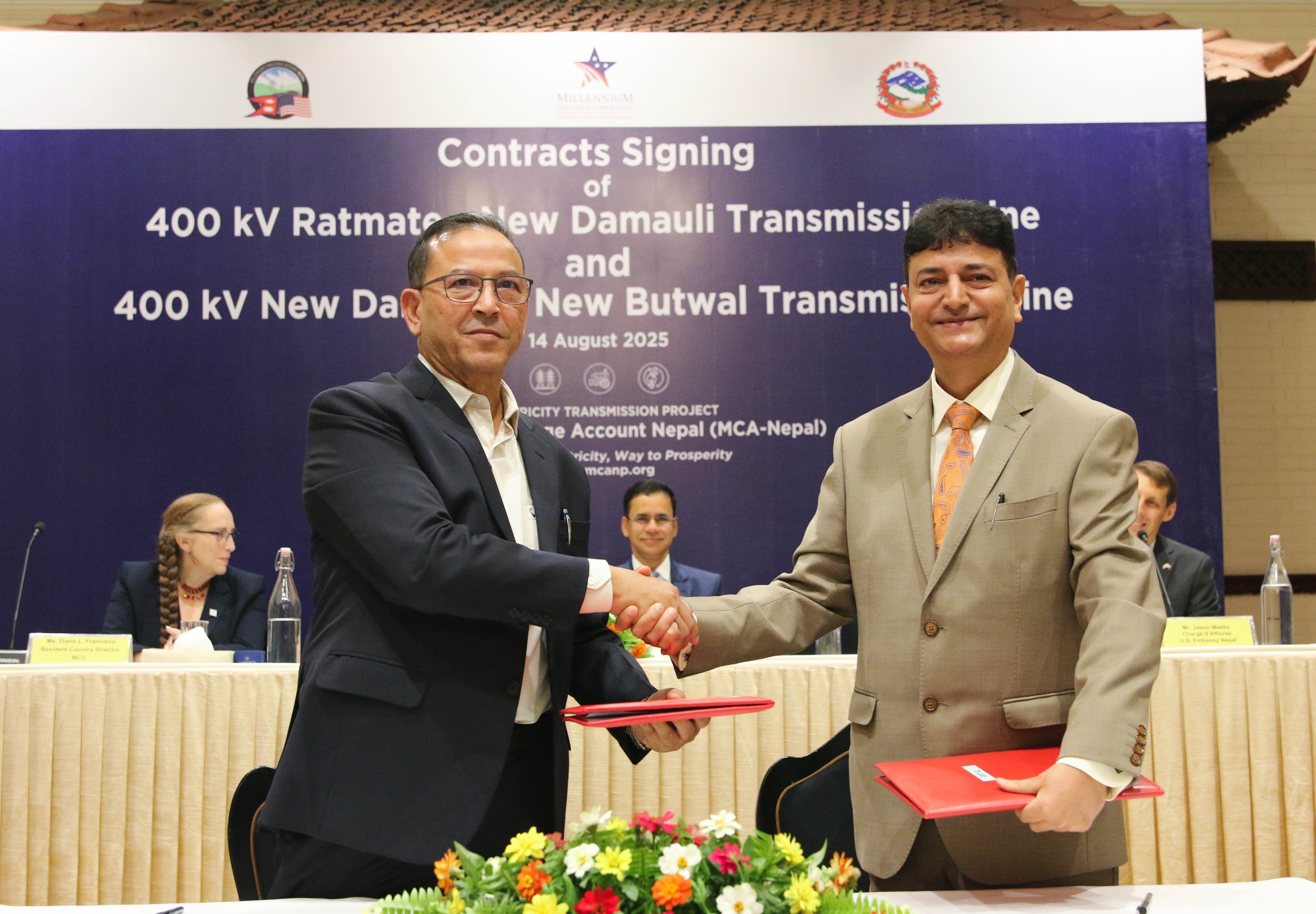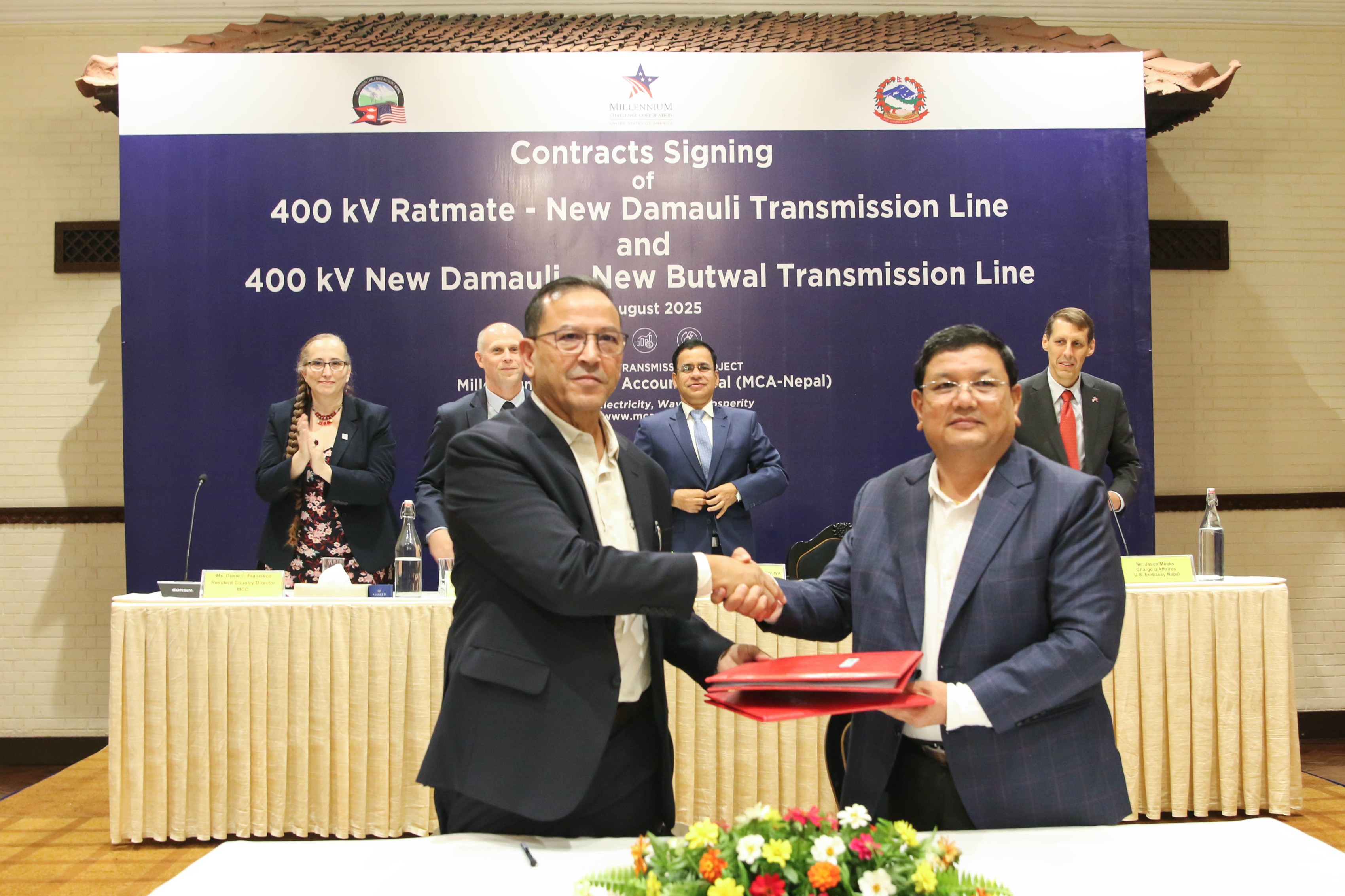 अर्थ मन्त्रालय, नेपाल विद्युत प्राधिकरण, एमसीसीका कार्यवाहक उपाध्यक्ष, एमसीसी आवासीय राष्ट्रिय नियोगका प्रतिनिधिहरू, अमेरिकी दूतावासका अधिकारीहरूको समुपस्थितिमा एमसिए–नेपालका कार्यकारी निर्देशक श्री खड्गबहादुर बिष्ट र दुई कम्पनीका प्रतिनिधिहरूले सम्झौतामा हस्ताक्षर गर्नुभएको हो।