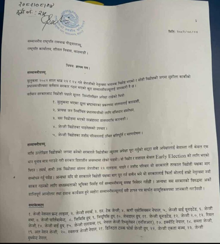 सोमबार २३ जेनजी समूहका प्रतिनिधिहरूले राष्ट्रपति कार्यालयमा ज्ञापनपत्र बुझाउँदै कार्की नेतृत्वको सरकारलाई फिर्ता बोलाएर नयाँ सरकार गठनका लागि मध्यस्थता गर्न आग्रह गरेका हुन्।