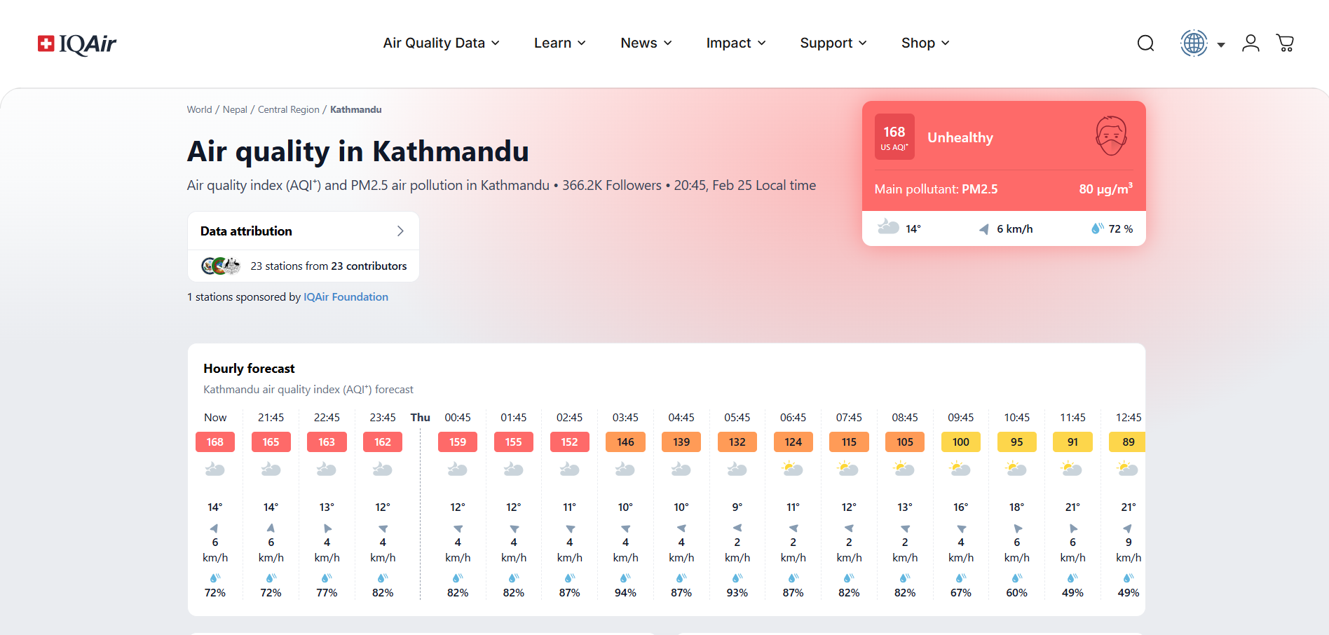 KATHMANDU — Air quality in Kathmandu has reached concerning levels, with the Air Quality Index (AQI) recorded at 168 as of the evening of February 25, 2026. This reading places the city's air quality firmly in the "Unhealthy" category, primarily driven by high concentrations of fine particulate matter (PM2.5) reaching 80 µg/m³.