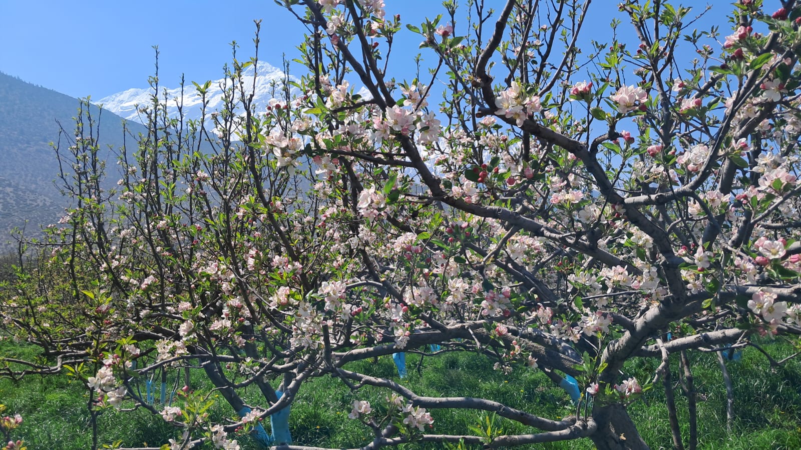 यहाँको स्याउ बगैँचा सेताम्मे भएका छन्। बगैँचाभित्रको स्याउका बोटहरु फूलेर सेताम्मे हुँदै जान थालेका हुन्।