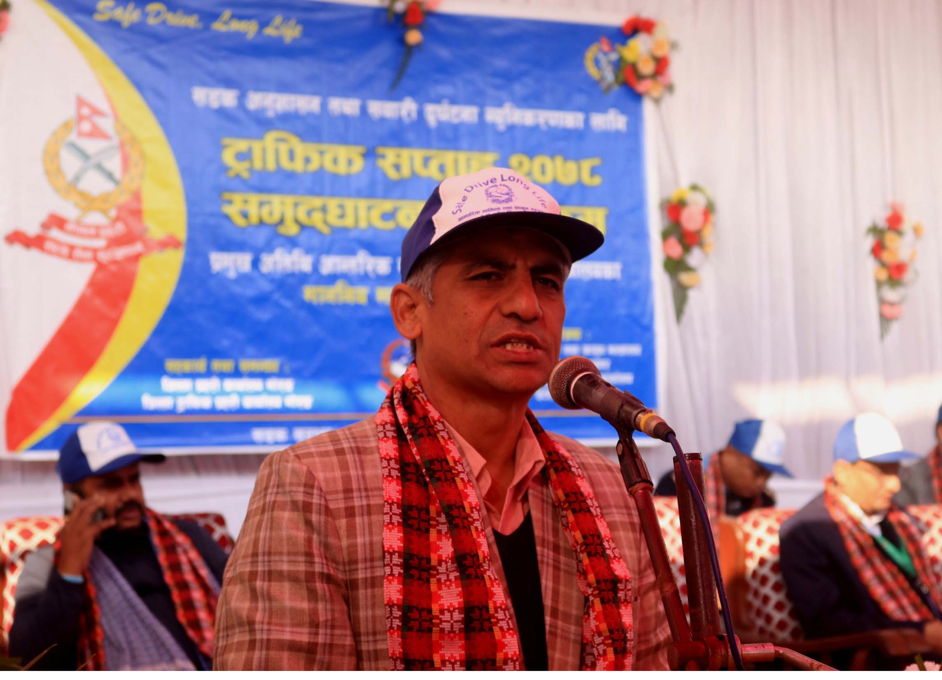 विराटनगरमा आइतबार आयोजित सडक अनुशासन तथा सवारी दुर्घटना न्यूनीकरण ‘ट्राफिक सप्ताह–२०७८’ शुभारम्भ कार्यक्रममा मन्तव्य व्यक्त गर्दै सामाजिक विकासमन्त्री जयराम यादव ।
