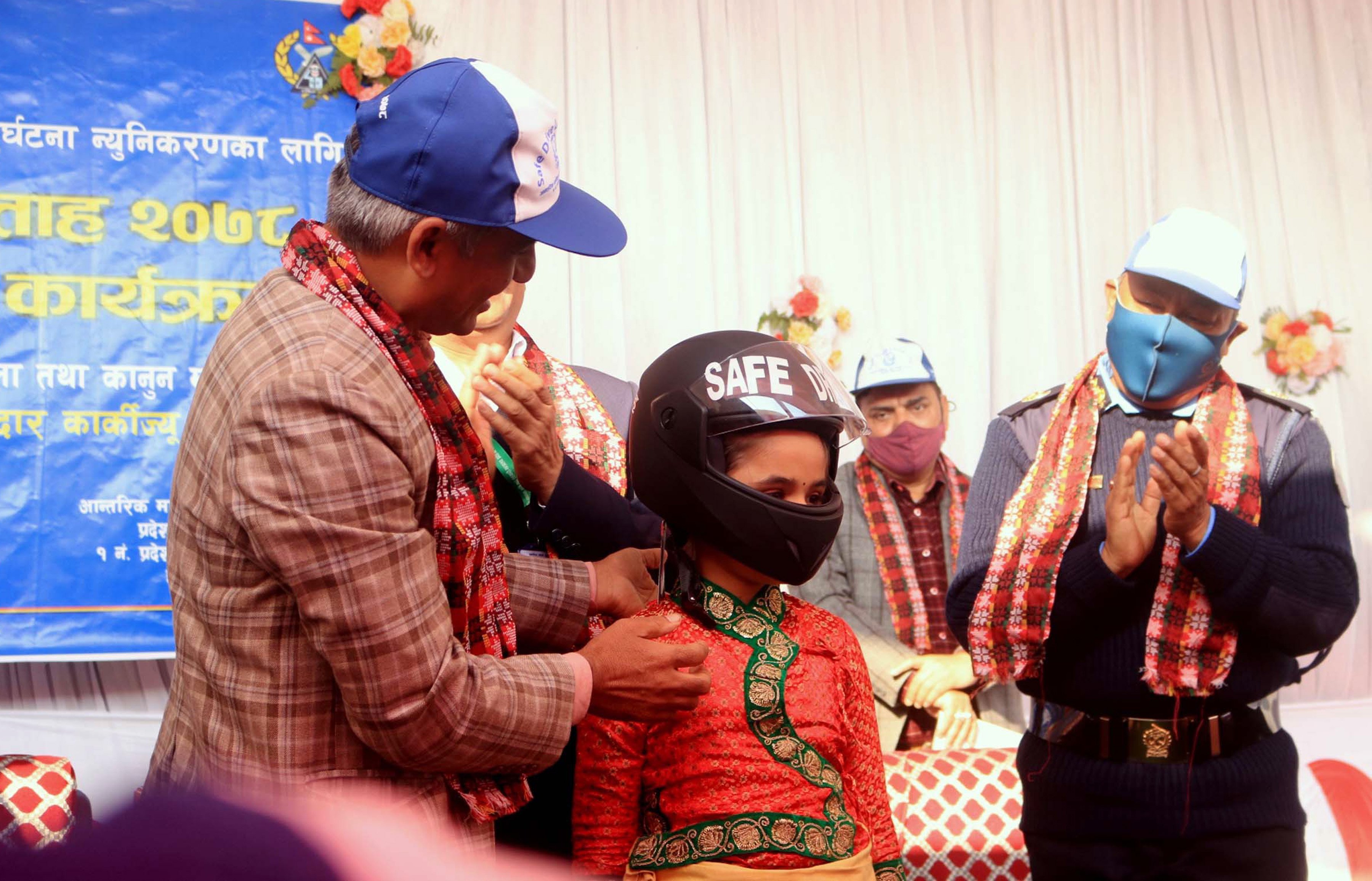 सडक अनुशासन तथा सवारी दुर्घटना न्यूनीकरण ‘ट्राफिक सप्ताह–२०७८’ को शुभारम्भ कार्यक्रममा आइतबार विराटनगरमा बालिकालाई हेलमेट लगाई जनचेतना जागृह गराउँदै प्रदेश नं १ का आन्तरिक मामिला तथा कानुनमन्त्री केदार कार्की ।