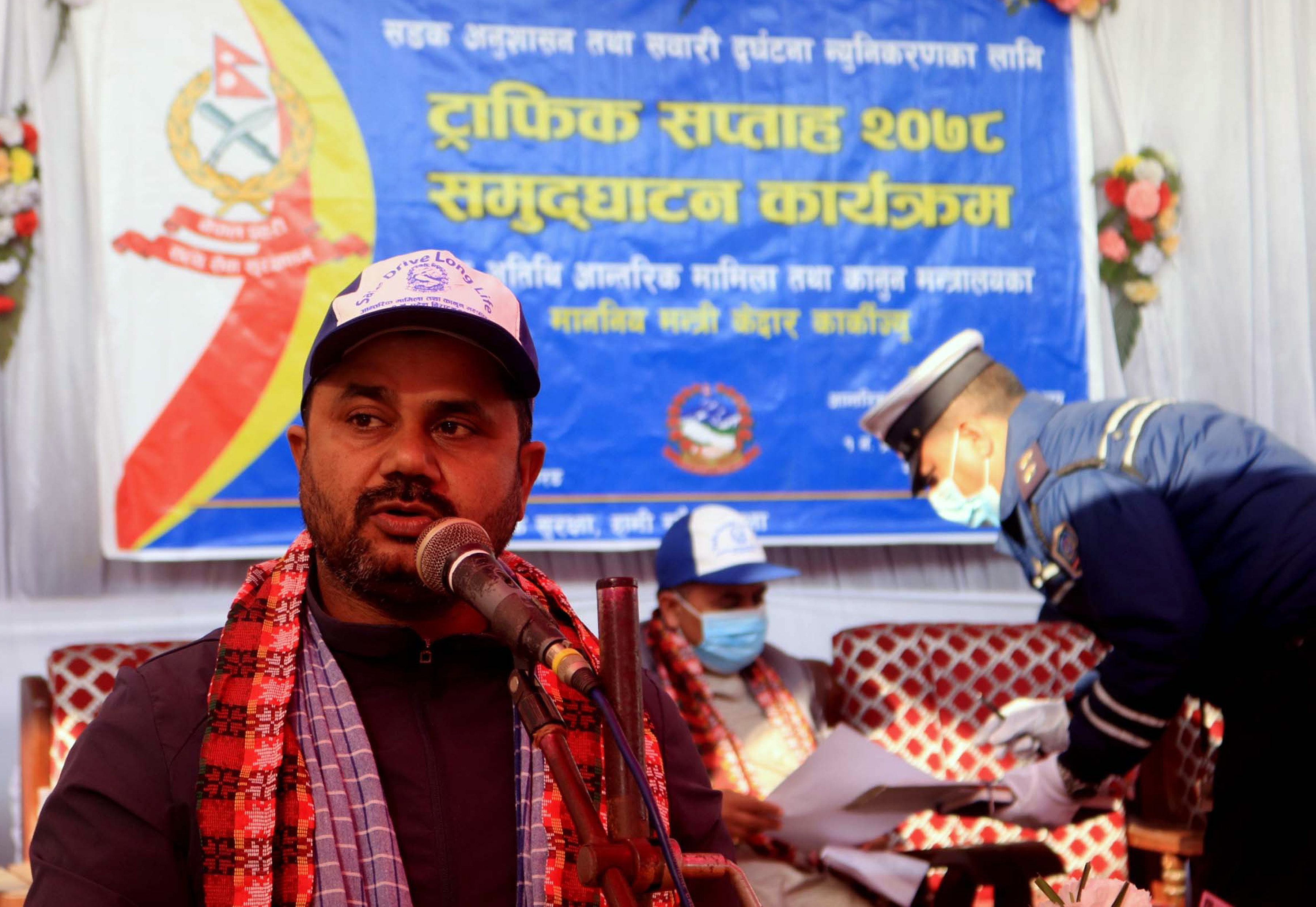 प्रदेश नं १ का आन्तरिक मामिला तथा कानुनमन्त्री केदार कार्की मन्त्रालय र प्रदेश ट्राफिक कार्यालयले संयुक्त रुपमा प्रदेशका १४ वटै जिल्लामा सुरु गरेको सडक अनुशासन तथा सवारी दुर्घटना न्यूनीकरण ‘ट्राफिक सप्ताह–२०७८’ कार्यक्रम विराटनगरमा आइतबार उद्घाटन गर्दै ।