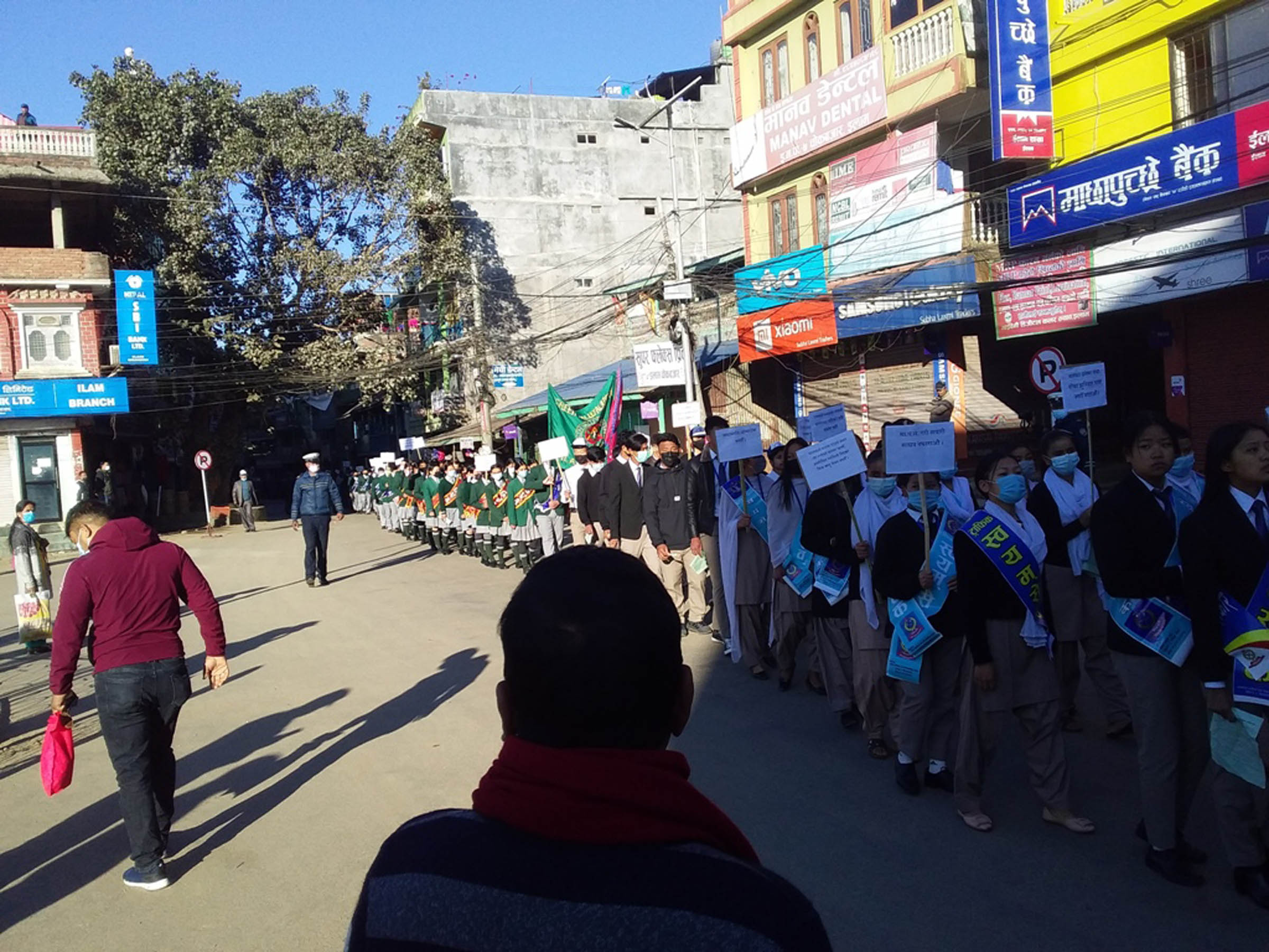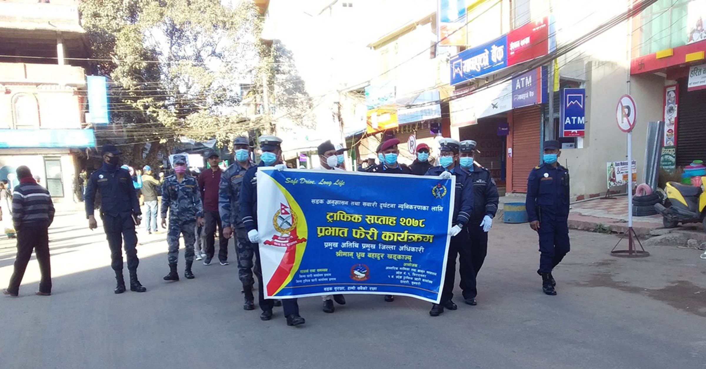प्रमुख जिल्ला अधिकारी श्रवणकुमार तिम्सिनाले सात वर्षीया बालिका रिसिका भण्डारीलाई ‘स्लो ड्राइभ लङफाइफ’ लेखिएको हेल्मेट लगाएदिएर ‘ट्राफिक सप्ताह २०७८’ शुभारम्भ गर्नुभएको हो । आजदेखि सुरु भएको अभियान पुस १० गतेसम्म सञ्चालन हुनेछ । त्यसअघि ‘मादक पदार्थ सेवन गरी सवारी साधन नचलाऔँ, सवारी चलाउँदा मोवाइल फोन प्रयोग नगरौँ, जेव्राक्रसबाट बाटो काट्ने यात्रीलाई प्राथमिकता दिऔँ’लगायत नारा लेखिएका प्ले कार्डसहित प्रभातफेरि गरिएको थियो ।