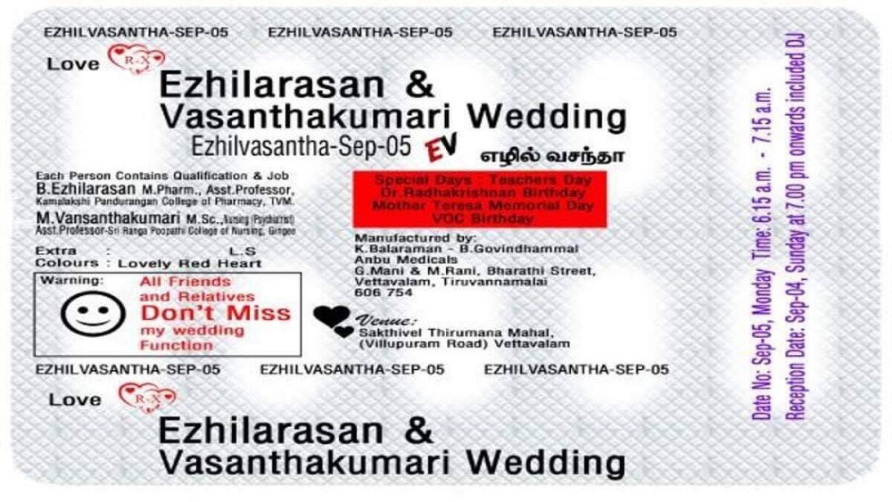 फार्मेशी पढेका एक भारतीय जोडीले आफ्नो विवाहको कार्डको डिजाइन पनि औषधीको खोलजस्तो बनाएका छन् ।