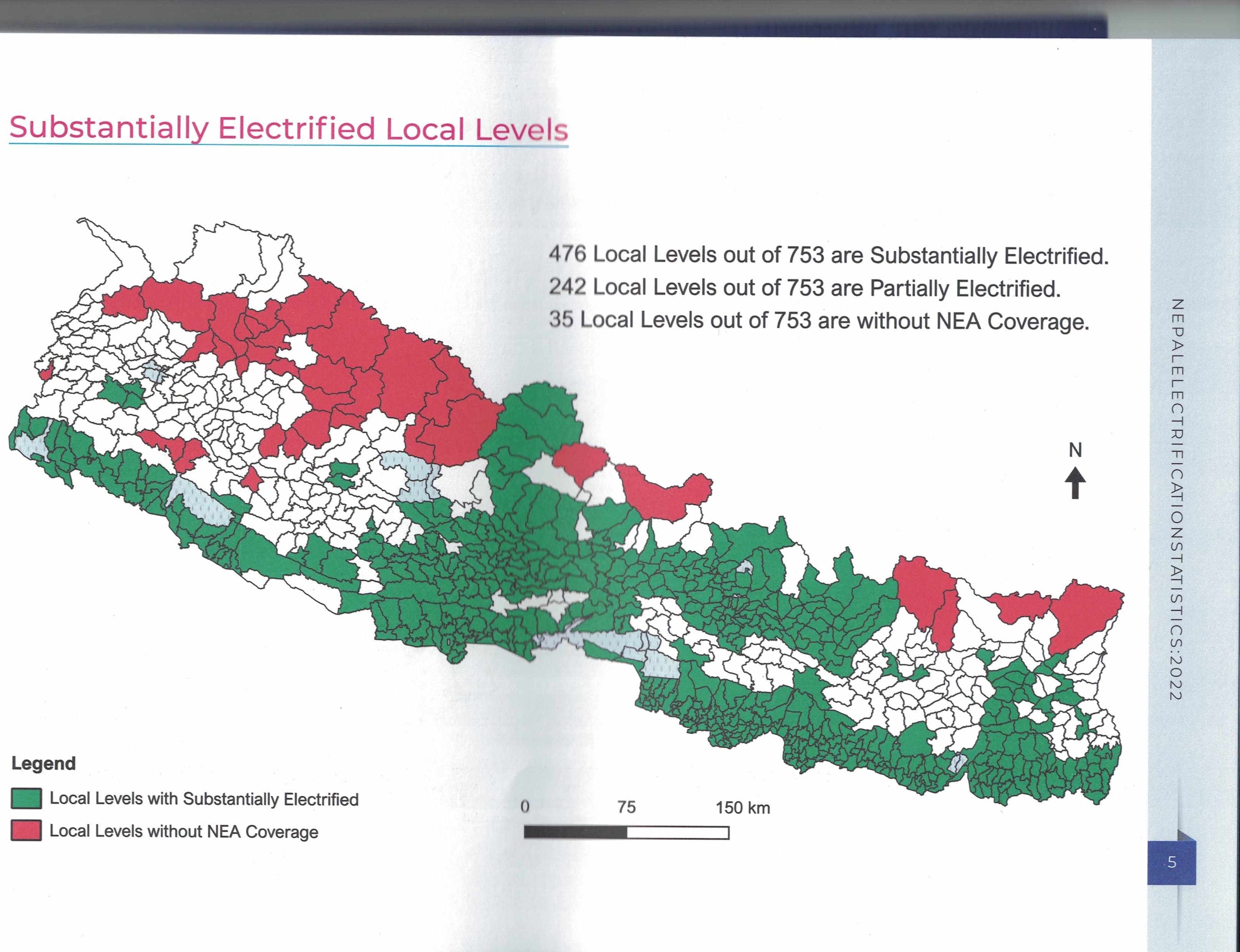 सात सय ५३ स्थानीय तहमध्ये हालसम्म कूल चार सय ७६ स्थानीय तहमा पूर्णरूपमा विद्युतीकरण भएका छन् । त्यस्तै दुई सय ४२ स्थानीय तहमा आंशिकरूपमा विद्युतीकरण भएको छ । आंशिकरूपमा विद्युतीकरण भएका स्थानीय तहमा पूर्णरूपमा सेवा उपलब्ध गराउने योजनाका साथ सरकार र नेपाल विद्युत् प्राधिकरण लागिपरेको छ ।