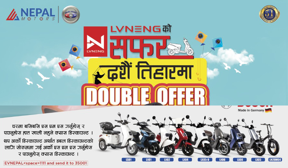 काठमाडौँ । बज्र ग्रुपको इभी नेपाल मोटर्स प्रालिले आगामी दसैँ तथा तिहारको लागि नयाँ अफर ल्याएको छ । कम्पनीले एक विज्ञप्ति जारी गर्दै दसैँ-तिहारको लागि ‘लेभ्लिंग सफर’ दशैँ तिहारमा ‘डबल अफर’ सार्वजनिक गरेको हो ।
